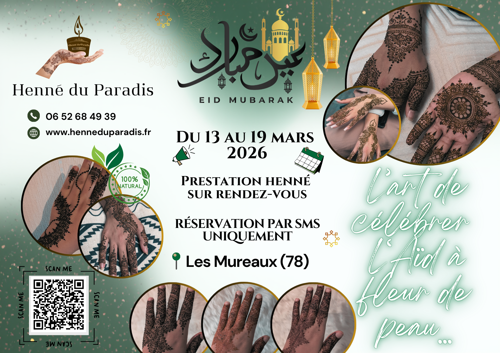 Publié 5 mars 2026 aux dimensions 2000 × 1414 dans Henné Aïd al-Fitr 2026 aux Mureaux (78) – Henné naturel sur rendez-vous.
